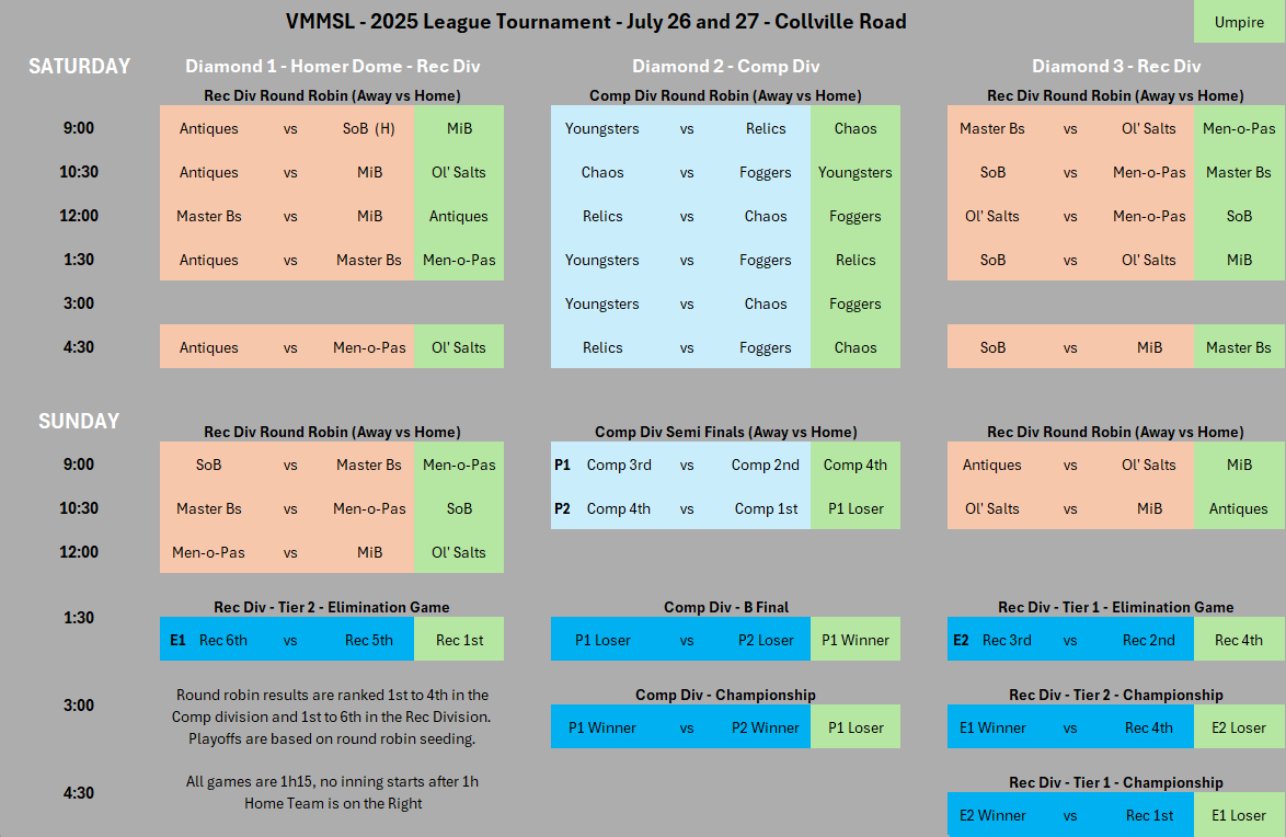 The Competetive division has lost one team so for 2025 there will not be two tiers. The Recreational division will continue to be divided into 2 tiers. Each tier will have 3 teams. Recreational teams will not play Competitive teams. There will be 18 regular season games in 2025. Teams will play within their tier at the Year-End Tournament.